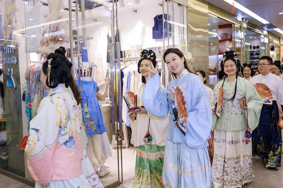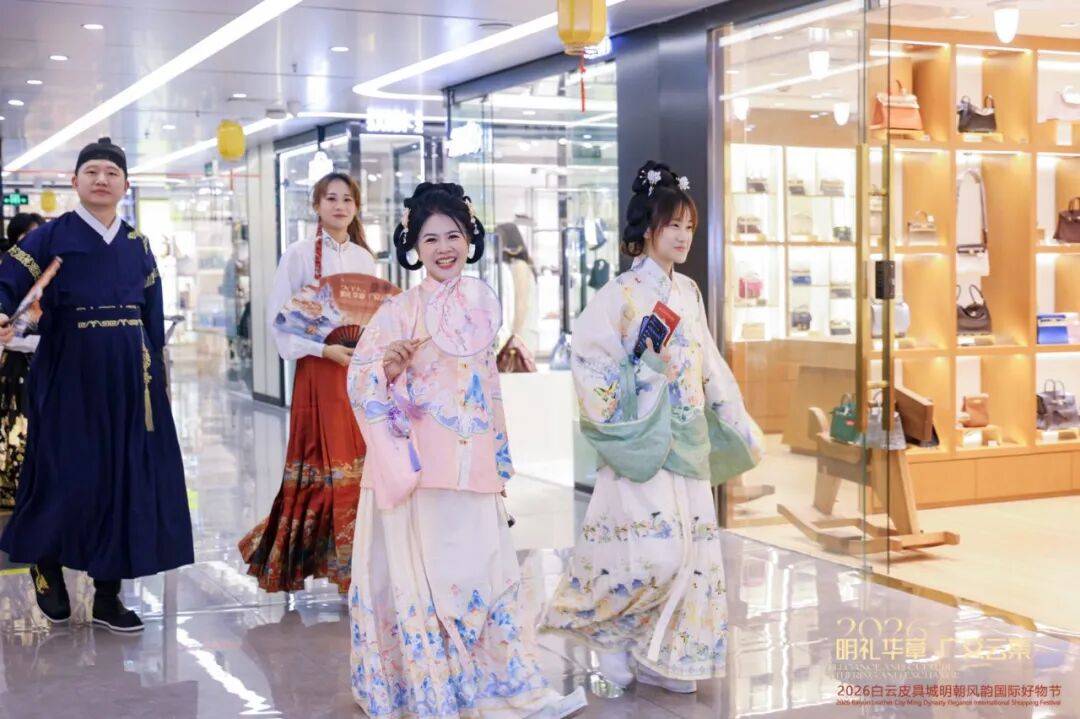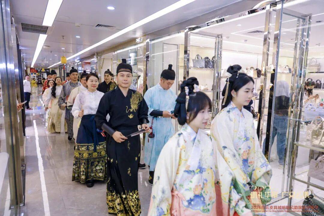巡游队伍从一期外广场出发,穿过仿明“宾至门”,沿商场主通道缓步前行。锦衣卫方阵手持绣春刀(道具),气宇轩昂;才子佳人手持团扇、折扇,风度翩翩;仕女队伍步履轻盈,衣袂飘飘。