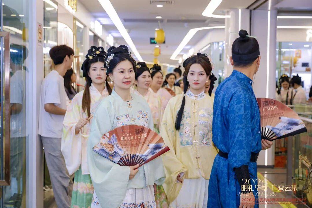 活动伊始,白云皮具城一期正门处,一座仿明代风格的“宾至门”巍然矗立,门两侧身着明服的“迎宾使”整齐列队,向每一位入场的客商行传统揖礼,致以诚挚问候。现场更有身着飞鱼服、佩戴绣春刀的“锦衣卫”方阵巡行于外广场,既是安保的象征,更化身流动咨询台,以古装形象为客商提供指引,引得不少外商纷纷驻足合影。